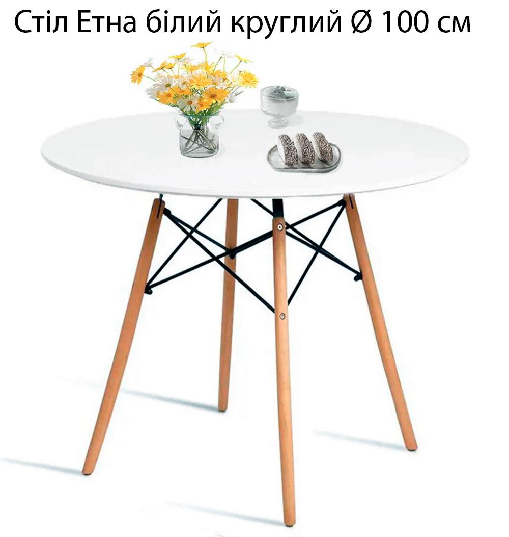 Стіл на кухню Етна МДФ круглий діаметр 100 см, білого кольору, на дерев'яних ніжках, Charles and Ray Eames DSW Table, стиль лофт, модерн, можна замовити в нашому інтернет-магазині з доставкою по всій Україні та Києві. Умови оплати та питання щодо доставляння товару Ви зможете обговорити з нашим менеджером у момент підтвердження замовлення.