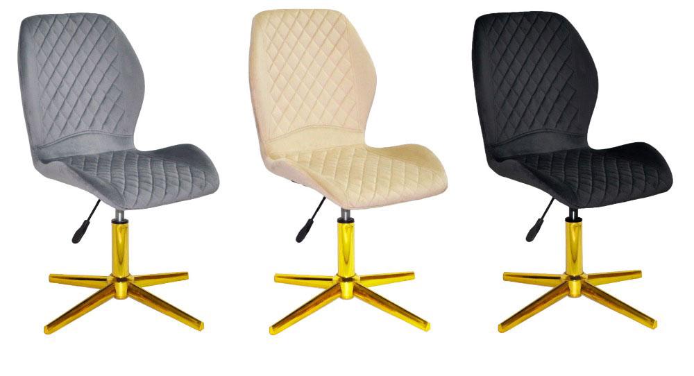 Стілець Fox GD-Modern Base поворотний з регулюванням висоти сидіння. Стілець Фокс ідеальне рішення для інтер'єру Вашого будинку, квартири, офісу, готелю, салону краси, дизайнерської студії, спа салону, ресторану, кафе та інших установ і закладів громадського простору. Стілець практичний, надійний і зручний. Сидіння зі спинкою м'які, обтягнуті меблевою велюровою тканиною, спинка прикрашена простроченням у формі дрібних ромбів. Надійною опорою цього стільця слугує золота нога-хрестовина зі стопками.